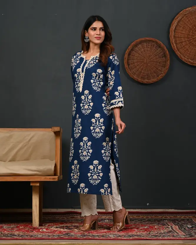 Women Printed Pure Cotton A-line Kurta (Blue)